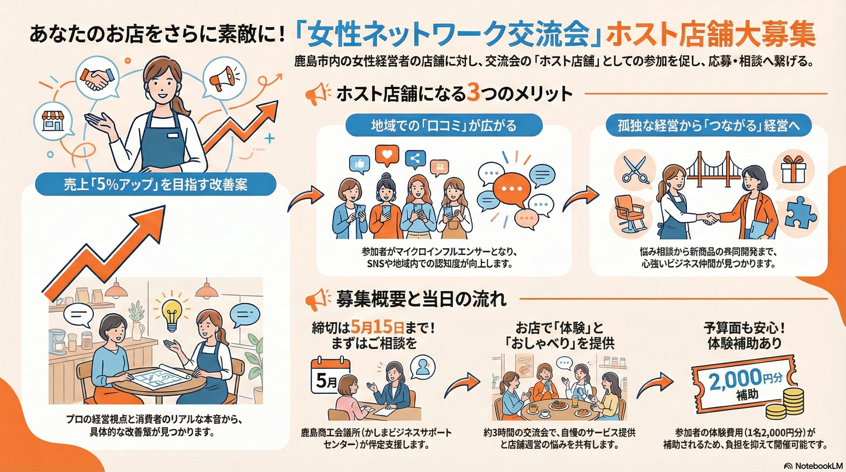 対象: 鹿島市内の女性経営者の店舗(飲食・美容・小売・宿泊など)